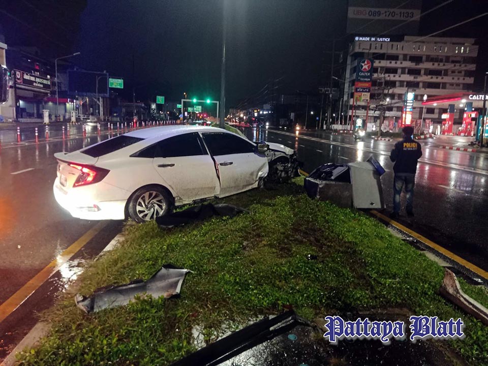 Die Behörden bestätigten, dass es sich um einen Alleinunfall handelte. Eine Person wurde verletzt und von Angehörigen umgehend ins Bangkok Pattaya Hospital gebracht. Bei dem Zusammenstoß wurde zudem ein staatlicher Elektrokasten beschädigt. Das Fahrzeug wurde später von einem Abschleppwagen geborgen.