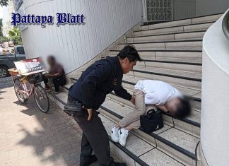 Städtische Beamte helfen betrunkenem Touristen auf Banktreppe in Pattaya