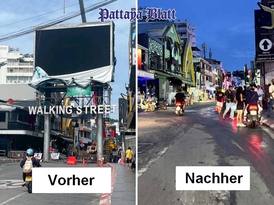 PATTAYA, Thailand – Die Stadt Pattaya hat mit dem Abbau des alten Eingangsschilds zur berühmten Walking Street begonnen und installiert derzeit ein neues LED-beleuchtetes Portal. Für die Modernisierung wurde der Zugang vorübergehend gesperrt – doch neben Fotobegeisterung sorgt das neue Schild auch für heftige Debatten.