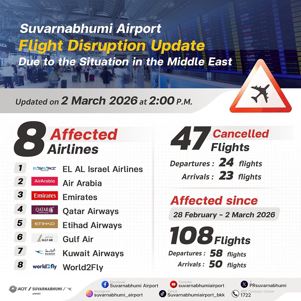 PATTAYA, Thailand – Am 2. März 2026 meldete der Flughafen Suvarnabhumi (BKK), dass acht Fluggesellschaften — darunter EL AL Israel Airlines, Air Arabia, Emirates, Qatar Airways, Etihad Airways, Gulf Air, Kuwait Airways und World2fly — aufgrund der Lage im Nahen Osten insgesamt 47 Flüge gestrichen haben.