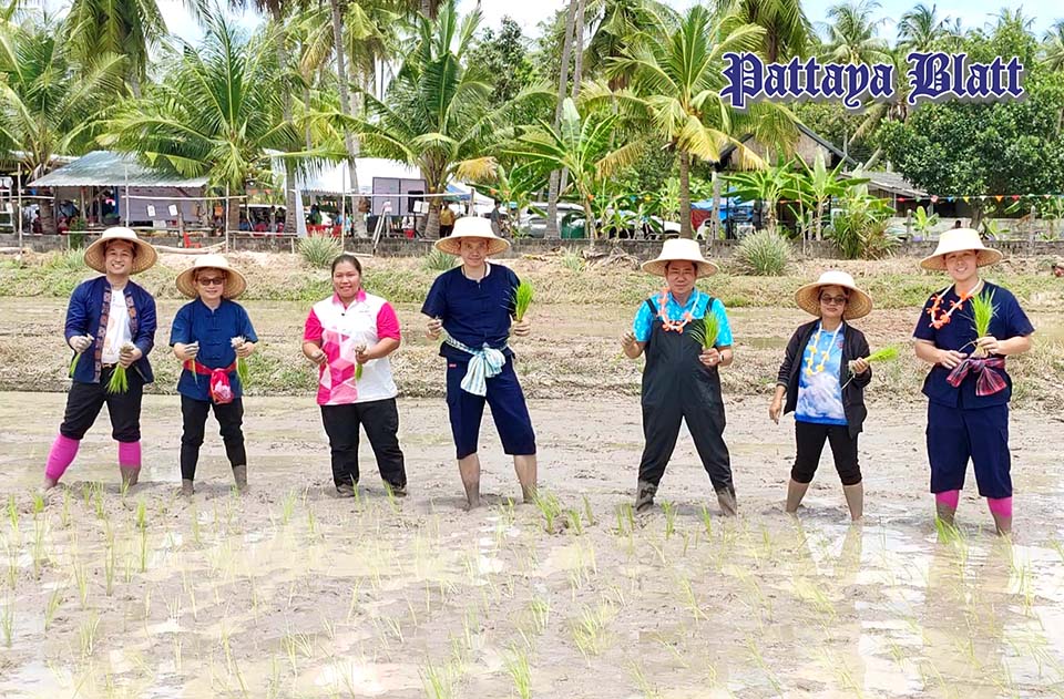 Bezirkschef von Banglamung pflanzt gemeinsam mit Anwohnern, während über 100 Schüler traditionelle Reisanbautechniken von lokalen Landwirten lernen.