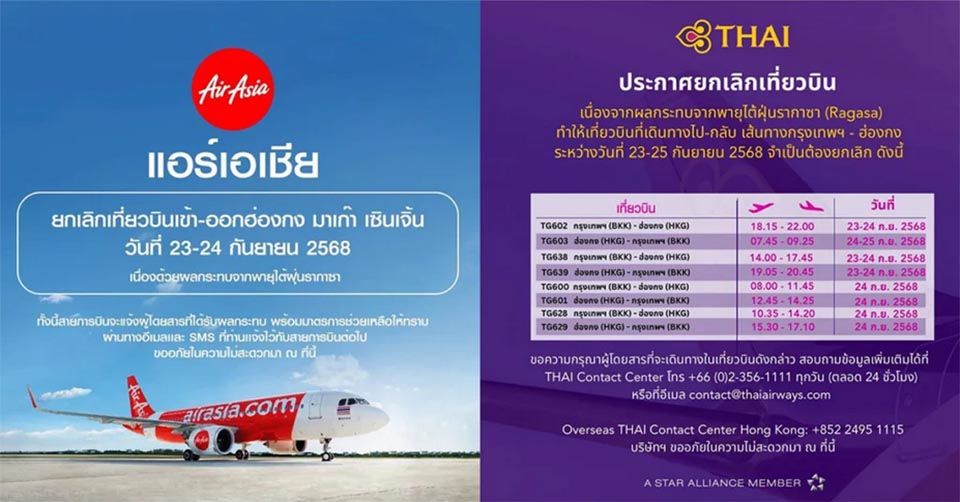 PATTAYA, Thailand – Die Thai Airways International (THAI) hat angekündigt, mehrere Flüge zwischen Bangkok und Hongkong vom 23. bis 25. September wegen des herannahenden Taifuns Ragasa zu streichen.