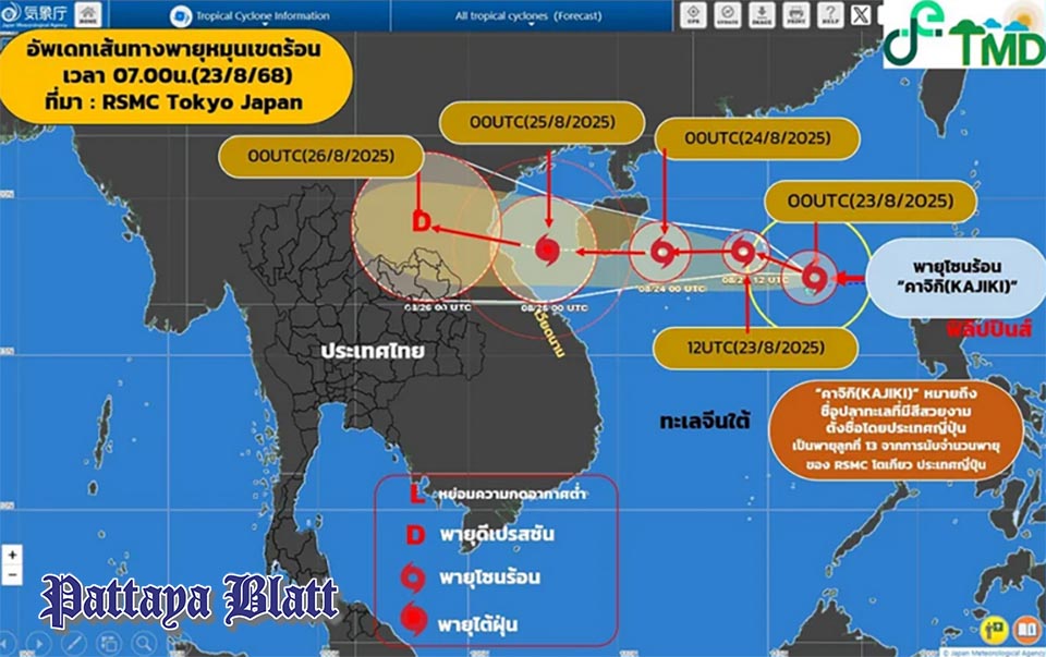 PATTAYA, Thailand – Das Meteorologische Amt berichtete am frühen Samstagmorgen, dass sich ein Tiefdruckgebiet im oberen Südchinesischen Meer zum Tropensturm „Kajiki“ verstärkt hat. Der Sturm wird voraussichtlich zwischen dem 25. und 26. August in Nordvietnam auf Land treffen und ab Sonntag, dem 24. August, Teile Thailands beeinflussen.