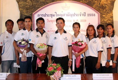 Pattaya Mayor Itthiphol Kunplome (centre) congratulates Thailand’s successful windsurfers who will represent the nation later this year at the Olympic Games in Rio.