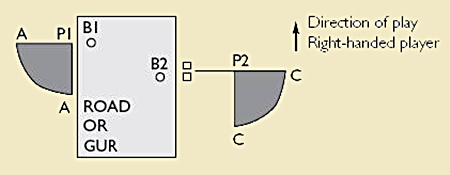 •  Two small squares = position of notional stance required to play ball at P2.