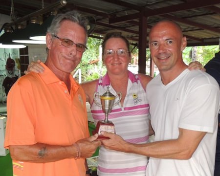 Scramble winners, Mickey & Andre are presented with their “Wish I was Here” Chad Memorial Trophy by Suzi Lawton.