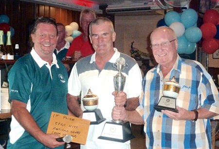 Gerry Hughes (centre) and Jim Elphick (right) receive their prizes after winning the charity golf day event at Green Valley.