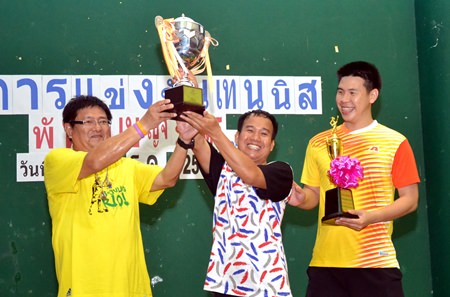 Tatchapong Katiwanitch, President of Pattaya Tennis Association (left) presents the winners’ trophy to a representative of the Tennis Association team.