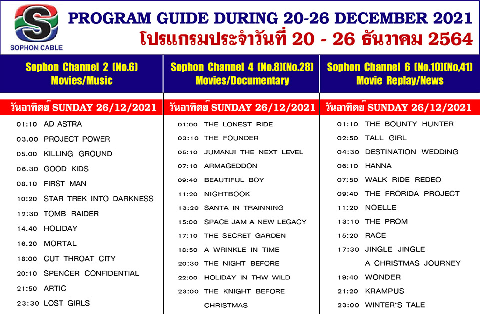 Arts & CultureDaily NewsletterTV GuideWhat's On in Pattaya-Thailand Sophon Cable TV Guide 20 – 26 December, 2021 By Pattaya Mail December 20, 2021 0 3100 Share on Facebook Tweet on Twitter tweet