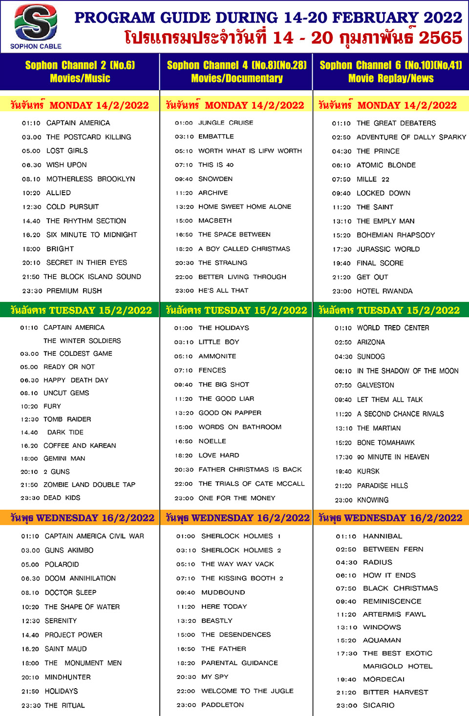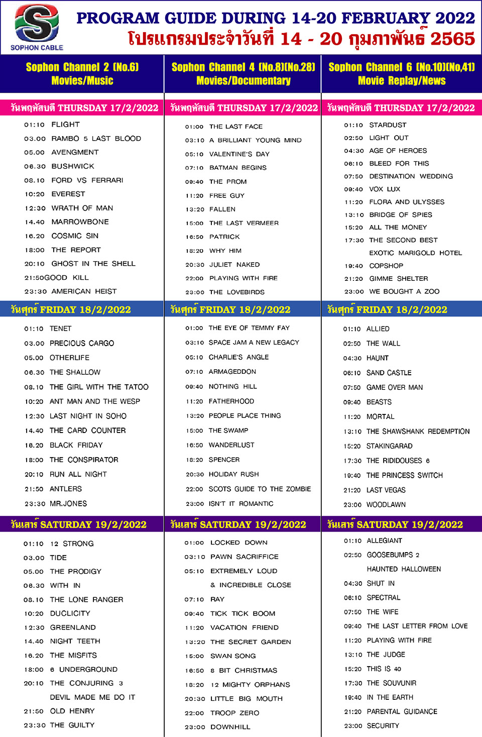 Arts & CultureDaily NewsletterTV GuideWhat's On in Pattaya-Thailand Sophon Cable TV Guide: February 14-20, 2022 By Pattaya Mail February 14, 2022 0 3557 Share on Facebook Tweet on Twitter tweet