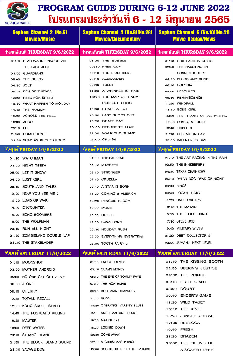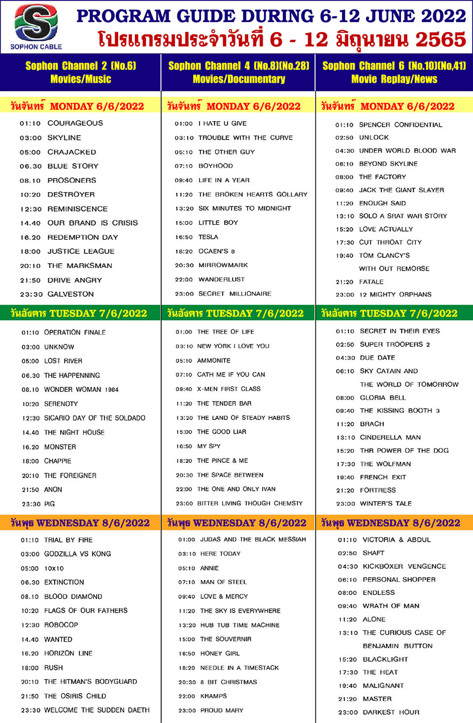 Arts & CultureDaily NewsletterTV GuideWhat's On in Pattaya-Thailand Sophon Cable TV Guide: June 6-12, 2022 By Pattaya Mail June 6, 2022 0 5288 Share on Facebook Tweet on Twitter tweet