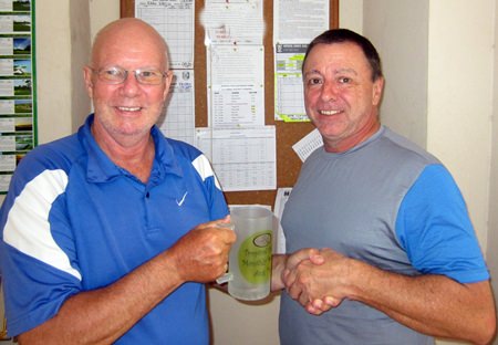 Dick Warberg (left) presents the MBMG Golfer of the Month prize to Mashi Kaneta.