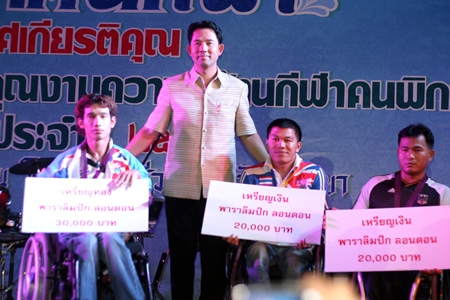 Ittipol Kunplome, Mayor of Pattaya City (center) presents awards to disabled athletes Watcharapol Wongsa, Sukhum Namlum and Sukachai Koizup.