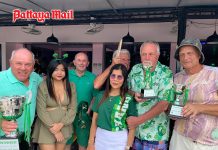 The Growling Swan NAGA Award was once again won by Growling Swan Mine Host Peter Grey who naturally accepted the award in terrific spirit and wore the red cap for a very long time back at the bar. Andrew “Turtle” Allen was kind enough to parade Deefa the Dog who collected many donations for the needy in Pattaya.