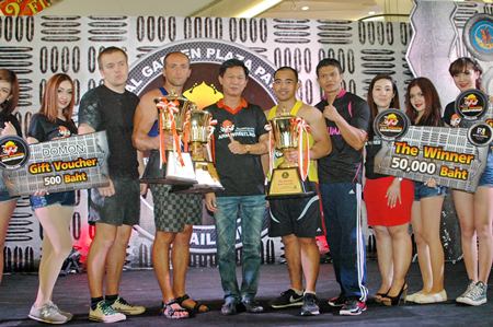 Arturs Dorohous of Latvia (left) and Thailand’s Suthiwas Kohsamut pose with the champions’ trophies at the conclusion of the 10th Pattaya International Arm Wrestling Championship at the Royal Garden Plaza, Saturday, Sept. 14.