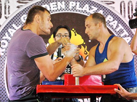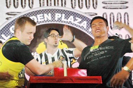 Champion arm wrestlers Arturs Dorohoff (left), winner of two categories, and Suttiwas Kohsamut (right), winner of the under 75kg event, face off in an exhibition bout during the 10th Pattaya International Arm Wrestling Championships held at the Royal Garden Plaza last weekend. 80 strong men from around the world competed for cash and trophies so big, only the strongest arms could carry them home.