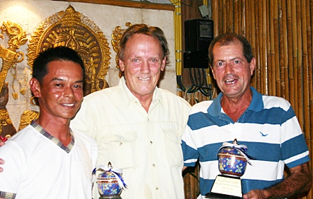 Club Captain David Thomas (center) presents the PGS ‘Player of the Year 2010’” awards to Wichai Tananusorn (runner-up) and winner Tony Thorne.