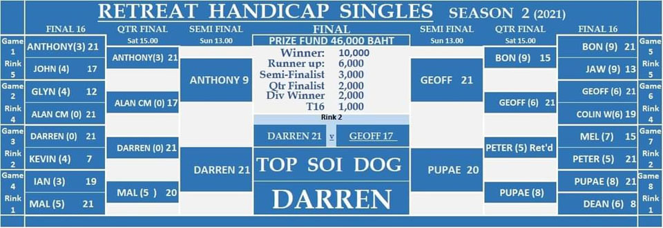 Geoff led 11-1 at one stage but Darren slowly pegged it back an went to 15-15 and then ahead 17-18 in amongst some heavy rain and premature darkness. But the floodlights came on to allow the game to finish but caused a lapse in concentration by Geoff and opened the door and let Darren in to take the game 21-17. Congratulations to Darren as Champion, to Geoff as runner up and all the finalists winning through in such a wonderful event.