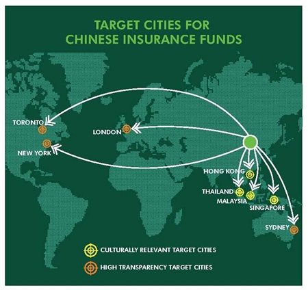Chinese insurance funds have more than US$14 billion available for overseas real estate investment, with high transparency markets, including the UK, US, Canada, Singapore and Australia, as well as Asian markets with similar cultural backgrounds such as Thailand, Hong Kong, Singapore and Malaysia, expected to be among the key targets, according to the latest research from global property advisor CBRE.