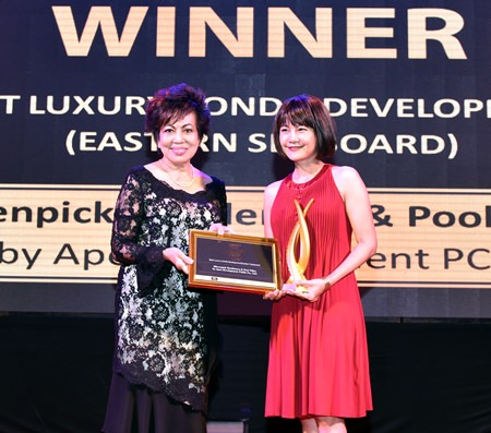 Jenny Sansiriumporn (right), Senior Vice President of Apex Development PCL, receives the Best Luxury Condo Development (Eastern Seaboard) award for the Movenpick Residences and Pool Villas from Nancy Suvarnamani of The National Association of Realtors during the Thailand Property Awards 2015 held in Bangkok in September.