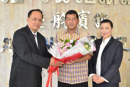 Chonburi Deputy Governor Chaowalit Saeng-uthai (centre) presided over the opening ceremonies for the “Project Management for Preparing an Action Plan for Road Safety” seminar, hosted by the Road Accident Victims Protection Co., Ltd., at the A-One Hotel, Pattaya recently. He was welcomed by F&B Manager Phuwanart Arunjit (left) and Front Office Manager Natrchaporn Sukprasert (right).