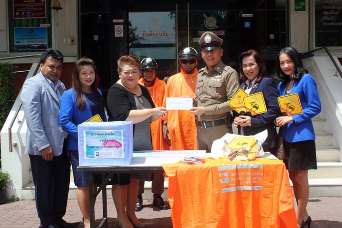 Jutaporn Huyakorn, Business Development Director of the Bangkok Hospital Pattaya presented 30 raincoats worth 10,000 baht to Pol. Lt. Col. Thanasit Kanlum for use by Banglamung police officers in the line of duty. The raincoats were funded by the Thai Health Insurance Office.