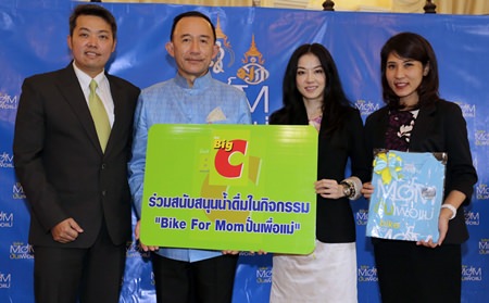 M.L. Panadda Diskul, Permanent Secretary to the Prime Minister’s Office, welcomed Warunee Kitjaroenpoonsin (2nd right), Director of Corporate Affairs and Voradej Krityakiarana (left), Senior Manager of CSR, Big C Supercenter PCL where they presented a large amount of drinking water for distribution to bikers who participated in the historical ‘Bike for Mom’ in honour of Her Majesty Queen Sirikit’s birthday.
