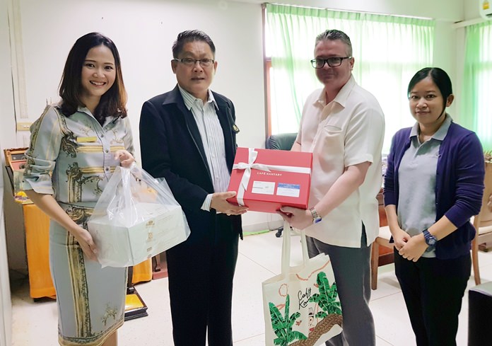 Around Pattaya & Thailand Cape Nidhra GM wishes District Chief a Happy New Year March 2, 2018 0 1432 Share on Facebook Tweet on Twitter tweet Cape Nidhra Hotel Hua Hin GM Christian Roschli and Sales Coordinator Laphatrada Kerdsuk paid a courtesy visit to Hua Hin District Chief Ruchprathip Tumrapeepatch (2nd left) to wish him good health and happiness over the coming year.