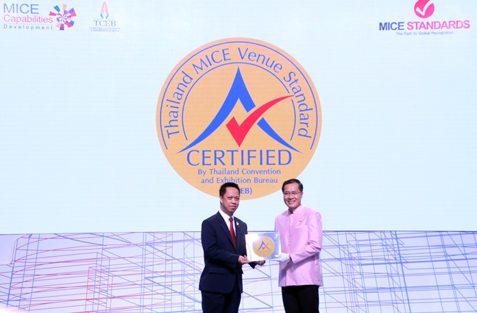 Neoh Keen Boon, GM of Dusit Thani Pattaya proudly accepts the ‘Thailand MICE Venue Standard’ award on behalf of the hotel from Khun Weerasak Kowsurat, Thailand’s Minister of Tourism and Sports during an awarding ceremony hosted by the Thailand Convention and Exhibition Bureau (TCEB) recently at the Bangkok International Trade and Exhibition Centre, known as BITEC Bangna, Bangkok. The award recognises and certifies the Dusit’s position in maintaining the quality and standard of MICE venue, not only in Pattaya but in the eastern region as a whole.
