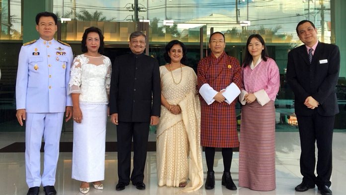 Magrin Promyothi (right), GM of Kantary Hotel, welcomes Nakhon Ratchasima Governor Vichian Chantaranothai (left), Indian Ambassador H.E. Bhawat Singh Bishnoi (3rd left), and Bhutanese Ambassador H.E. Tshewang Chophel Dorji (3rd right) to the hotel during their visit to Korat to attend the Visakha Bucha World Buddhist Festival recently.