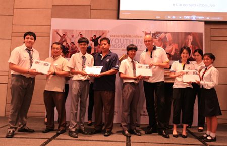 Rudolf Troestler (4th right), General Manager of Hilton Pattaya presents certificates of achievement to fifty young students from Aksorn Pattaya Technological College who attended the open house activities at the hotel recently. Hilton Worldwide hotels and corporate offices around the globe host hundreds of events to inform those looking for employment, including young people, about the vast array of exciting opportunities available to all in the hospitality industry.
