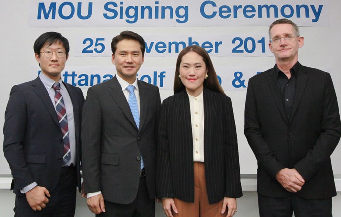 Pattana Golf Club & Resort recently signed an MOU with Golfzon Yuwon Holdings Co., Ltd., from Korea for development in services and to strengthen sufficiency between both companies. (L to R) Kim Hong Min Golfzon Yuwon Holdings Co., Ltd.’s Assistant Manager / Membership Business Team; Shin Jong-Seong Senior Vice President of Golfzon Yuwon Holdings Co., Ltd.; Rujirapun Juangroongruangkit, Vice President of Pattana Golf Club & Resort; and Thomas Tapken, Managing Director of Pattana Golf Club & Resort.