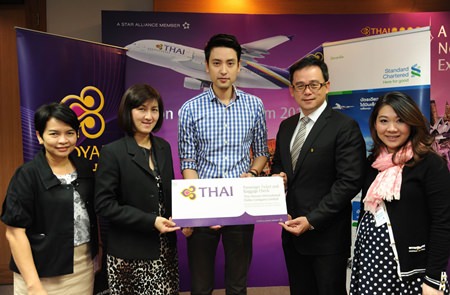 Management of Thai Airways International Public Company Limited (THAI) Royal Orchid Plus and Standard Chartered Bank congratulate Pongsatorn Prucsasri (centre), who participated in Standard Chartered Bank’s Facebook competition and won two roundtrip tickets from Bangkok to Hong Kong in Economy Class. (l-r) Sopita Luengrungsri, THAI Chief, Program Partnership Group, Jittima Udayachalerm THAI Department Manager, Royal Orchid Marketing Department, Saksit Pitipongsoonthorn, Standard Chartered Bank, Senior Vice President, Marketing Consumer Banking, Thailand, and Wasuna Ruayphoophan, Standard Chartered Bank Senior Manager, Cross-Sell and Business Development.