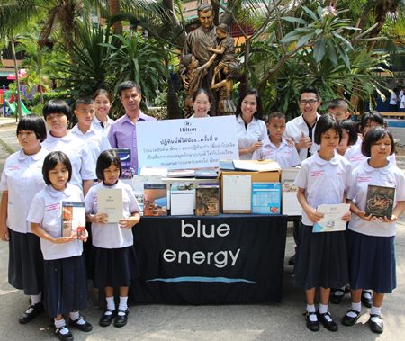 Plum Phatrarika (centre), Director of Business Development for Hilton Pattaya, together with the Hilton ‘blue energy’ team donated used calendars to Pattaya Redemptorist School for the Blind recently. Over 300 calendars of the past years were collected from hotel’s team members and these used calendars will be converted into a special notebook for blind and visually impaired children by the Pattaya Blind School. Chid Sooknu (back row, 2nd left), Blind School Manager was on hand to welcome the benevolent team.
