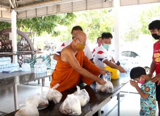 Temple abbot leads devotees in giving food to Pattaya community