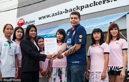 Asia BackPackers-Pattaya was awarded a certification by Dream Hygiene in recognition for being the first hostel in Thailand to meet a 27 point plan regarding reducing the effects on allergy sufferers (full details on the 27 Point Plan see dreamhygiene.com). Statistics given by world health authorities show that 20% of the world’s population suffers from allergies. (L to R) Nong Thundercliffe (Dream Hygiene), Sumlee Janthu, Supaporn Saardiam (director Dream Hygiene), Supaporn Janseng, Josh Peatfield (Director), Alisa and Marisa Jongram are shown outside the hostel at the award ceremony.