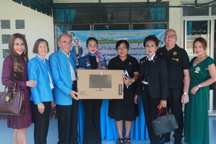 President Maneeya Engelking (4th left) of the Rotary E-Club Dolphin Pattaya International, with Charter President Dr. Otmar Deter, PP Dr Margret Deter and members of the club, visited the Nong Ta-aun sub-district Health Promoting Hospital recently where they donated computers and printers valued at 35,000 baht. On hand to receive them was Mrs. Suchanan Kantee (4th right) director of the medical centre.
