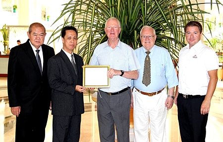 Representatives of the Rotary Club of Jomtien-Pattaya, headed by Philip Wall Morris, Service Projects Chairman, Brendan Kelly and Ronny Heltne presented a Plaque of Appreciation to Neoh Kean Boon, resident manager and Waran Chalermrithichai, Director of Administration of the Dusit Thani Pattaya in gratitude for the hotel’s kind sponsorship and generous support of the 2011 Rotary Charity Cross Bay Swim recently. Funds raised from this event helped to provide clean drinking water to thousands of children and residents of the outlying communities in Thailand.