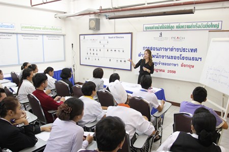 Gearing towards the upcoming economic integration of the ASEAN Economic Community, the Royal Cliff Hotels Group has advanced its employee training program with interactive international language workshops including English, Chinese, Japanese, Korean and Russian to enhance, expand and develop necessary language skills to its new recruits and current employees. The sessions which are well attended by over 50 people from various departments cover useful vocabulary and important phrases that are frequently used in their line of work.