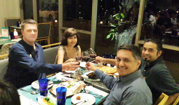 During the recent ‘Stay with U by the Sea’ media and corporate tour of the U Jomtien Pattaya Hotel, the management hosted a dinner for executives of the media and travel agencies at the Salt Restaurant where they enjoyed a fusion of Thai and European cuisine. (L to R) Axel de Boynes, GM of U Jomtien Pattaya, Sue Kukarja and Prince Malhotra, DMD of Pattaya Mail, and Vikrom Malhotra, DMD of Massic Travel.