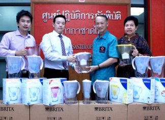 Dr. Manu Leenawong (2nd left), MD Aqua Innotech (Thailand) Co., Ltd., together with GM Suradej Darayen (left), donate 60 Brita Water Filters valued...