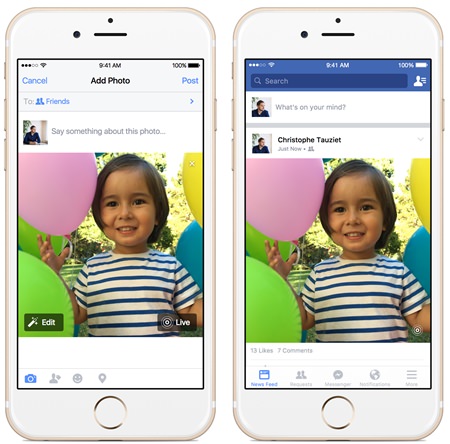 This photo provided by Apple and Facebook demonstrates the posting of an animated photo using Facebook’s new app, left, and the viewing of it, right, on an iPhone. The latest iPhones come with the ability to turn still images into video, known as Live Photos. Facebook, one of the leading forums for photo sharing, began supporting the feature on Monday, Dec. 21, 2015. (Courtesy of Apple and Facebook via AP)