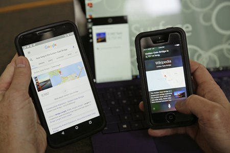 In this Monday, Dec. 7, 2015, photo, Associated Press technology writer Brandon Bailey uses the Google, Cortana and Siri digital assistants to learn the length of the Golden Gate Bridge in San Francisco. Cortana’s learning the neighborhood. Google’s digital assistant can’t tell a joke. And Siri apparently has a thing for the metric system. Those are just a few of the things learned after staging a face-off between the three leading digital assistants. (AP Photo/Eric Risberg)