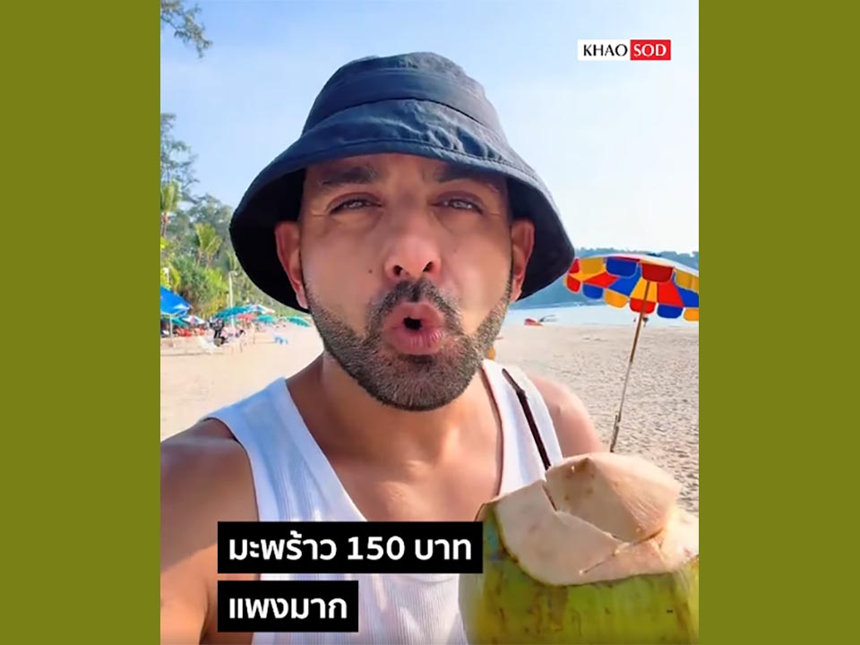 A foreign tourist reacts in surprise after paying 150 baht for a coconut on a Phuket beach, a moment that sparked widespread debate online over tourist pricing, value expectations, and spending habits in major travel destinations. (Photo from Khao Sod)