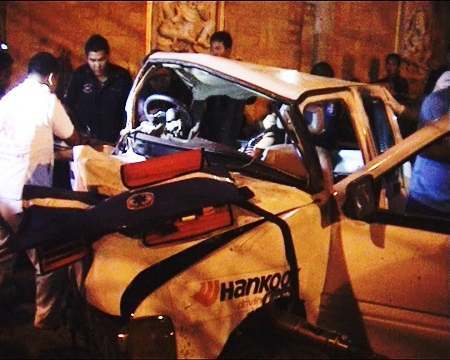 The unnamed 20-year-old Thai male driver and his 18-year-old girlfriend were both found dead in the cab of the Isuzu pickup after the 3:40 a.m. crash on a soi next to Nong Yai Temple. Five passengers in the back were injured.