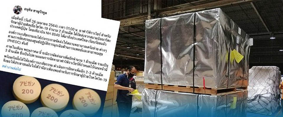 Mr Anutin wrote on his Facebook account that at 1am (on April 26) 2 million pills of favipiravir drug on the NH8545 flight from Narita airport in Japan arrived in Thailand and the Government Pharmaceutical Organization would distribute them to hospitals right away in accordance with the allocation plan of the Public Health Emergency Operations Center.