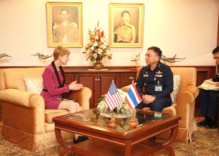 Ms Kristie Kenny, the US ambassador to Thailand, has paid a courtesy call on National Council for Peace and Order (NCPO) Deputy Chief Air Chief Marshal Prajin Juntong, who is in charge of economic affairs in Thailand. The meeting, which took place at the Royal Thai Air Force headquarters ,addressed several issues, with human trafficking being one of the main topics.
