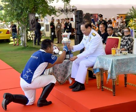 The captain of the King Power team is presented with the winning trophy by H.E. Privy Councilor, Air Chief Marshal Chalit Pukbhasuk.