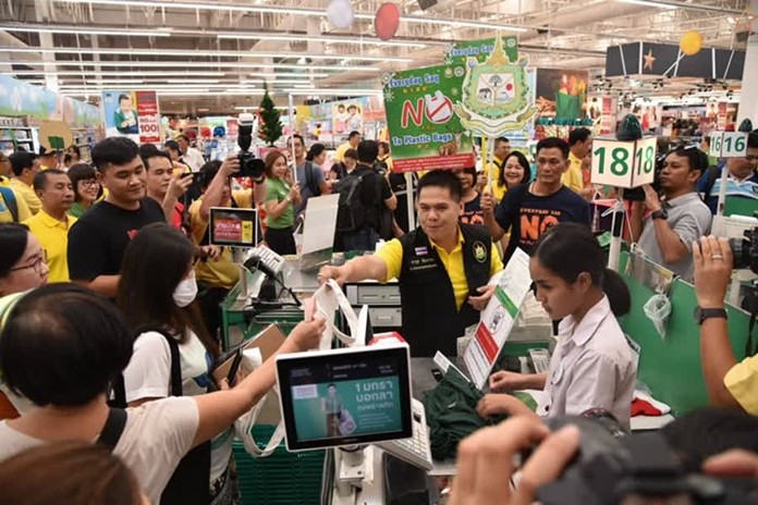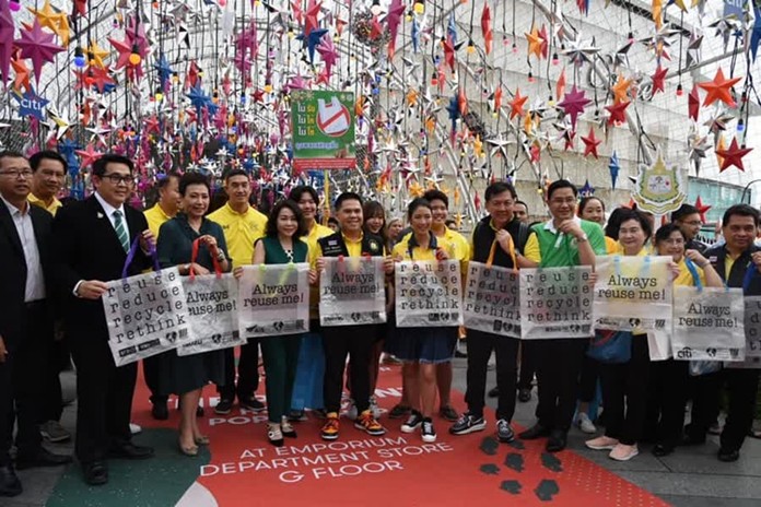 The Natural Resources and Environment Minister, VarawutSilpa-archa, and a team of officials visited four major malls in Bangkok, including Tesco Lotus in On Nut, EmQuartier, Central Chidlom and Siam Paragon, to seek public feedback on the “Everyday Say No to Plastic Bags” campaign. More than 90 giant retailers, department stores and supermarkets, earlier reached an agreement with the ministry to stop handing out all types of single-use plastic bags to their customers.