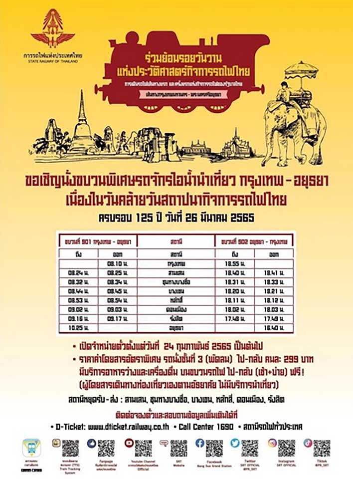 SRT PR director Ekarat Sri-arayanpong said the trip was planned on March 26 to celebrate the 125th anniversary of the SRT and commemorate the inaugural train trip from Bangkok to Ayutthaya that King Rama V launched on March 26, 1896.